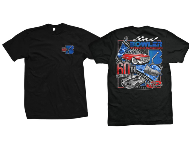 Just in, a fresh design from the crew at Graphic Disorder. This is our 60th year in business, so we are celebrating with a limited edition T-Shirt. This car features Cline Bowler's 1961 Sunliner that kicked the company off in 1963 and Mark Bowler's 1991 Z28 which transitioned the company into the Performance Transmission company it is today. Celebrate with us and support a family business and buy a shirt. These are NeXT Level Cotton & Poly blend quality shirt that is comfortable.