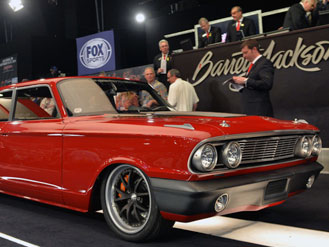 The interior of this 1964 Ford Fairlane comes from Unlimited Upholstery and the Ringbrothers’ own custom designs. It’s full of billet aluminum details, like the machined-aluminum prop rods that hold up the sunshades. It also features custom stock bench seats, a Ringbrothers custom design dashboard, push-button electric door latches, and Vintage Air HVAC and EATON fittings. The 1966 Oldsmobile steering wheel also features a IDIDIT tilt column. “Afterburner” also has a few modern upgrades with the Alpine/MTX sound system with GPS, Sirius, and Bluetooth functions. “Afterburner” sold at the 2014 Barrett-Jackson auction with less than 1,000 miles on it since the restoration finish.