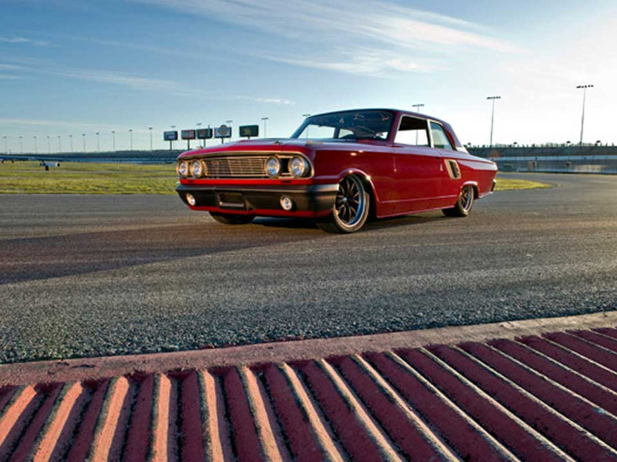 This gorgeous project car debuted at the 2009 SEMA Show in Las Vegas. Nicknamed “Afterburner,” it’s based on a two-door 1964 Ford Fairlane. The full makeover included a carbon fiber hood, fenders, front and rear bumpers, side intakes, and deck lid spoiler. The Ringbrothers’ billet aluminum decorates the car from engine bay to tail lamps. The shiny paint job features three different colors from BASF R-M Diamont: Afterburner Red, Agent Orange, and Mission Brown. The show-stopping look is rounded out with a set of Forgeline three-piece wheels.