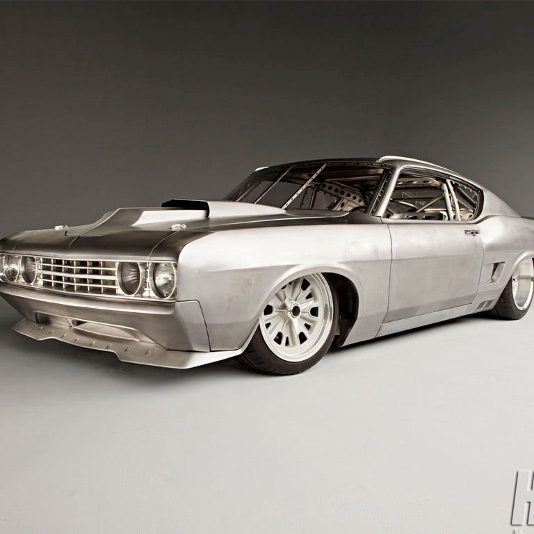 While George and Troy were walking around the Columbus Goodguys show a few years back, George came up with the idea for a Talladega inspired car, but with the pattern of a Mercury Cyclone that he already owned. So he sent his Cyclone to the Rad Rides team and they began some intense metalwork. In an interview with Hotrod.com, George says: “Those Talladegas were so ugly ’cause the nose stuck out so far on ’em. I knew we were going to remake the front end; it’s basically the same thing that Holman Moody did to those Talledagas—we just made it a lot shorter.”