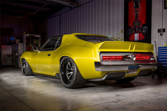 Some of the body customization includes a new hood, front fenders, grille, and front valance. They extended the Javelin’s wheelbase by moving the wheels forward 6.5″ and the wheel arches were recreated in carbon fiber. The newly extended wheelbase is supported by a Detroit Speed Hydroformed front subframe which was originally engineered for a Camaro. Ringbrothers went to town machining customized tail lights, bumpers, trim, and engine bay out of a block of aluminum at their Wisconsin based shop.